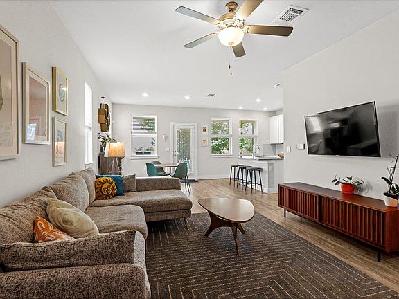 Welcome to this beautiful home in the amenity-rich Easton Park community, where modern style meets everyday convenience. The home is located within walking distance from all of the future retail options in the area - including a coming soon HEB, various restaurants, a nail salon, and more! Even with its convenient location, the home feels peaceful with an extended deck space in the backyard with a large oak tree behind the deck for added privacy and a pleasant view! Step inside to find an open floorplan with durable LVP flooring throughout the main level. The kitchen features crisp white cabinetry, granite countertops, stainless steel appliances, a center island, and an oversized pantry that extends under the stairs - perfect for storing bulk goods and off-season decorations. Just inside from the garage, a built-in drop zone keeps bags, shoes, and everyday essentials neatly organized. A convenient powder bath on the main level makes hosting guests a breeze. Upstairs, an open landing offers a versatile space that’s ideal for a reading nook or a dedicated work-from-home desk. The primary suite is a true retreat, complete with a tray ceiling, huge walk-in closet, and a full bath with a double vanity & walk-in shower. Built by Meritage Homes, known for their energy-efficient homes, the structure features spray foam insulation (even in the attic) and a tankless water heater, both of which help to conserve energy and keep those utility bills low. As part of Easton Park, residents enjoy access to parks, miles of trails, community pools, organized social events, & so much more—making this home the perfect blend of comfort, privacy, and lifestyle.