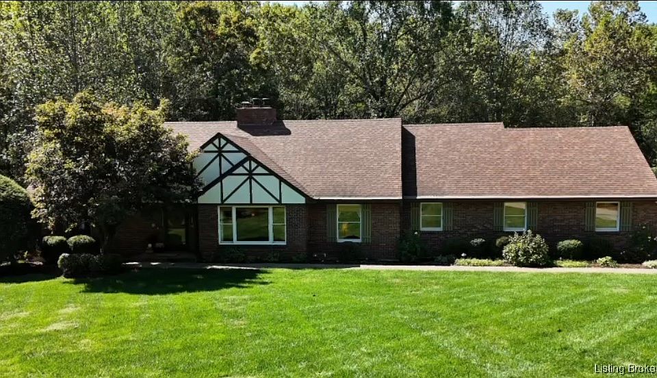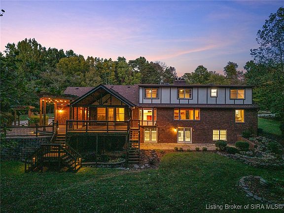Don’t miss out on this 2-story executive Tudor-style home on 4.87 acres! With over 5100 sq ft, this 4+ BR, 4.5 BA home blends privacy, character & convenience—just 2 miles from FCHS & HHMS, 4 miles to I-64, & 15 min to Louisville. Tucked away on a quiet cul-de-sac, this home invites you to enjoy private trails, a flowing creek, & outdoor living spaces featuring a TN River Rock terrace, covered cedar deck, decorative pond w/ water feature, & firepit. Oversized attached 2-car garage plus insulated brick detached 3-car garage w/ paved drive, trailer-height door, & electricity. A rare blend of charm, functionality & acreage in Floyd Co. The main floor offers formal living & dining rooms, a warm family room open to the eat-in kitchen, four-seasons room, half bath, & spacious laundry. Extensive custom cabinetry throughout. Fully remodeled in 2020, the main-floor primary suite offers a spa-style bath w/ soaking tub, oversized shower, new cabinets, & walk-in closet w/ built-ins. Upstairs features 3 spacious BRs & 2 full BAs, both remodeled in 2020. The finished walkout basement includes a full BA, flex room ideal for office or non-conforming BR, & large rec room w/ wet bar & gas fireplace. Additional areas include craft room & large unfinished storage space w/ workbench. Well-maintained w/ key updates: Refinished Hardwood Flooring, 2021 Hardie Board & beam replacement, full exterior paint, some new Andersen windows main floor, Roof 2015, W/ Gutter Helmet. Portable generator included.