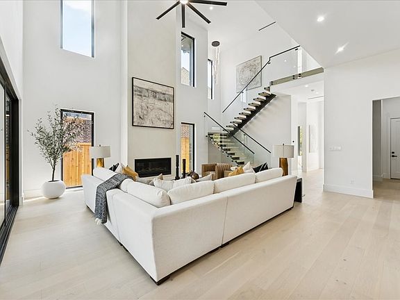 Inside, soaring 22-foot ceilings frame a Venetian plaster fireplace, while a floating glass staircase with motion LED accents serves as an architectural centerpiece. The chef’s kitchen is anchored by a 12-foot waterfall island, paired with Thermador panel-ready appliances and a Bosch-equipped back kitchen for added function.