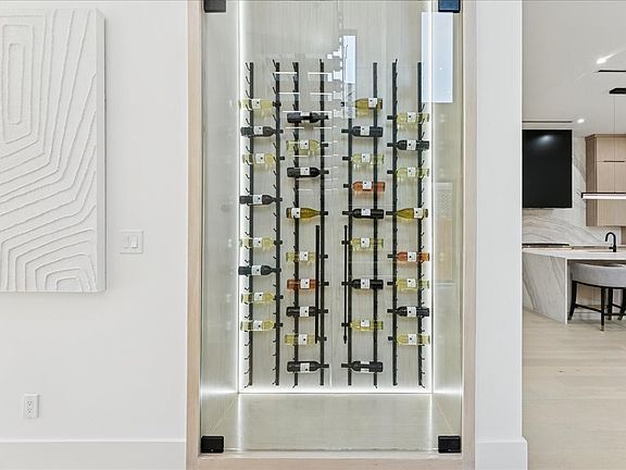 Highlights include a glass-enclosed wine display accented in oak, a wet bar connecting the media and game rooms, and spa-like bathrooms with thoughtfully curated stonework. The first-floor primary suite offers a serene retreat with a spa bath and custom rift oak cabinetry. A secondary guest bedroom is also conveniently located on the first floor, with a moody guest bath attached. Upstairs, three en-suite bedrooms are complemented by a media room, game room, and flexible space for a gym, studio, or office.