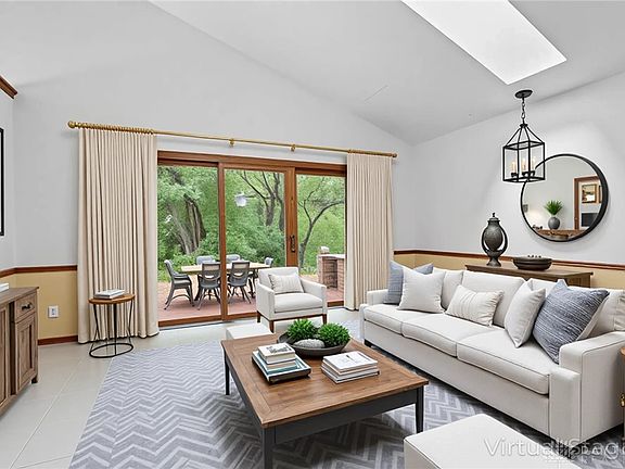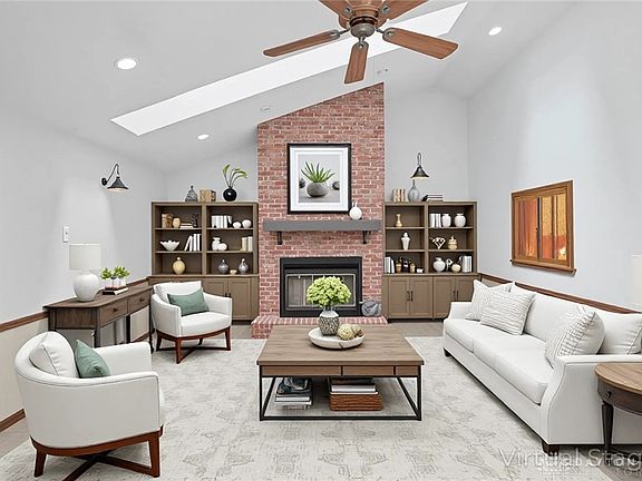 Skylit bathSpacious primary suiteCathedral ceilingsSingle-level livingBrick gas fireplaceWalk-in closetDressing area