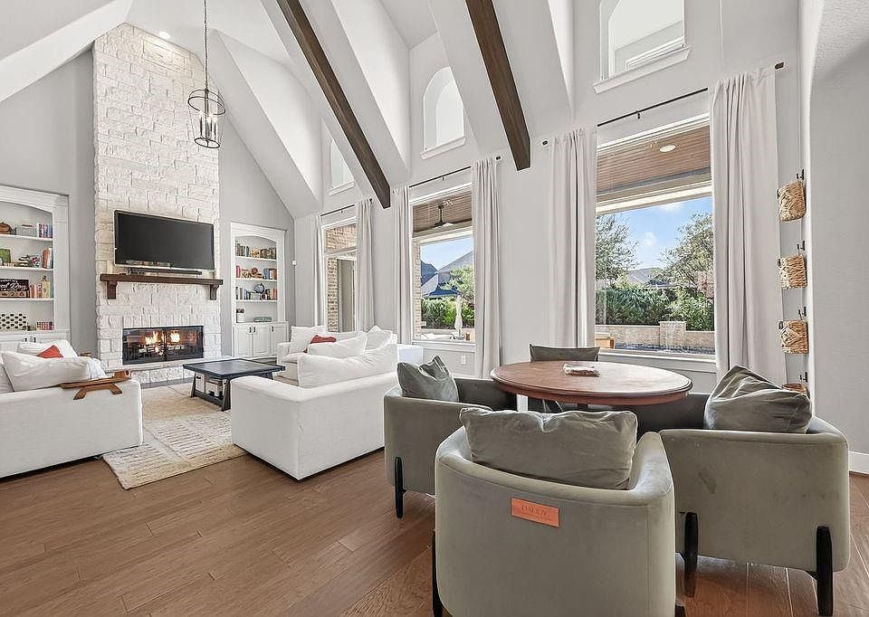 .WOW! Stunning Highland-built designer showcase in Cane Island’s gated section with all bedrooms on the first floor and perfect pool/spa retreat. 4-bedroom home 4 private ensuites, plus 3 half baths and delivers true 5-star living with refined design and sophisticated finishes. Cozy front courtyard with fireplace, living room cathedral ceilings w/wood beams, a stone fireplace, arched hallways, and an ideal open layout. Private study for work-from-home. Dream kitchen with large island, designer backsplash, double ovens, floor-to-ceiling cabinets with lighted uppers, and custom desk area. Hotel-style primary suite with wood feature wall, sitting area, spa bath, and huge walk-in. Custom fine wine cellar, oversized game room, theater-style media. Casita feel bedroom 4 with kitchenette. Resort-style pool/spa with fountains, Texas-size covered patio with wood ceiling. Easy access to all the walking and biking paths that lead to the incredible amenities that make Cane Island great.