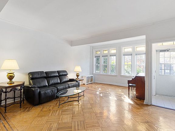 Spacious, six room top floor apartment is accessible through its own private entrance. Beautiful parquet flooring throughout. The spacious kitchen features dual crank windows and has abundant wood cabinetry. There is a large formal dining room equipped with a large window alongside a spacious bright and sunny living room featuring a cherry wood ceiling fan. The front third bedroom is equipped with its own closet. Hall closet is located off the full bathroom equipped with a bathtub and window. Spacious primary bedroom features dual closets. The second bedroom is also equipped with its own closet.
