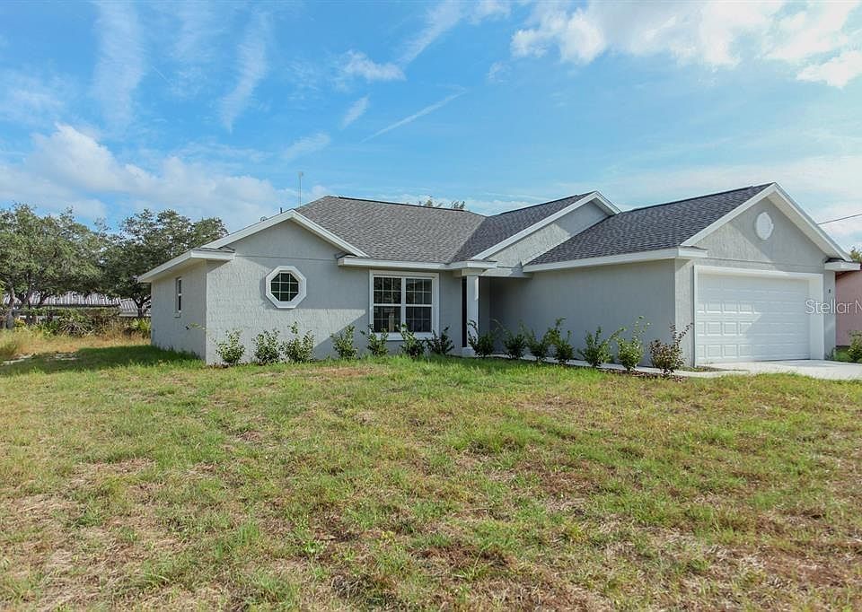 NEW CONSTRUCTION SW OCALA! Beautiful BIRCH III model almost complete and ready for new owners. This 3/2/2 home features 1755 sq ft of living space plus a large garage. As you enter the home, you can simply feel the space of the Great room that leads into the dining area and kitchen. The kitchen features wood shaker cabinets with striking beautiful granite countertops and stainless steel appliances including refrigerator, dishwasher, range and microwave. In addition, there is an island with seating as well as room for meal prep. The master bedroom is spacious and in the master bathroom you find a walk in shower as well as a separate soaking tub. Going through the bathroom you enter the large walk-in closet. The guest bedrooms both feature wall closets and ceiling fans. The guest bathroom has a tub/shower combo with tile walls. Throughout the main area and bathrooms, you find gorgeous LVT flooring and carpet in the bedrooms. Walking out of the dining area through the French doors leads you to the oversized backyard. Close to schools, shopping, I75 and hospitals, this home is centrally located. Low emissive windows and LED lighting throughout. OWNER FINANCING AVALIABLE ** PICS ARE FROM MODEL HOME- COLORS/OPTIONS MAY VARY
