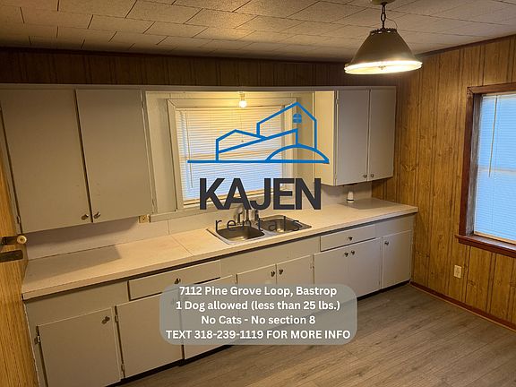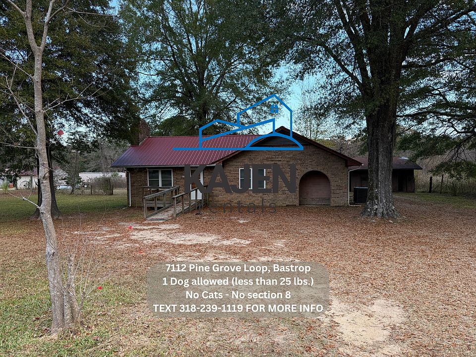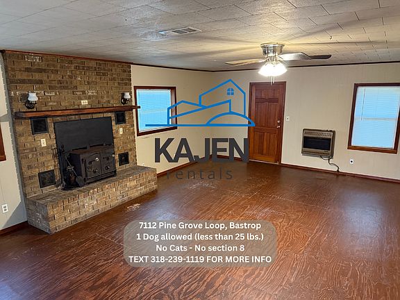 -No Section 8 -1 Dog allowed (less than 25 lbs.) with $200 (nonrefundable) Pet Processing & Lease Addendum Fee and monthly pet rent. **No cats. -No rent to own -No smoking inside -Rent is $825.00 -Deposit is $700.00 -Income will be verified on each tenant. -Central Heat and AC. -Located at 7112 Pine Grove Loop Rd Bastrop 71220 -Includes stove. -3 bedroom 2 bath home. -You pay utilities (water, gas, electric, trash, Lawncare) -$50 application fee per adult.