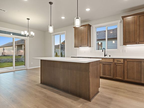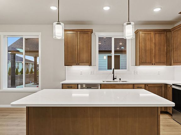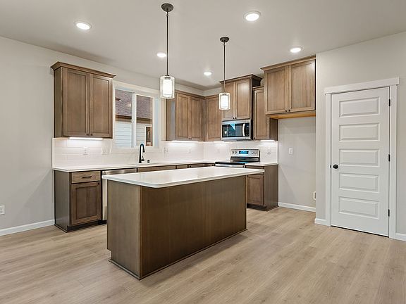 Single Level with Large Great Room and Covered Patio! Amenities include 9ft ceilings, Covered patio, Stained Cabinets, Quartz Slab Countertops in Kitchen and Bathrooms, Stainless Appliances, Full Height 4 by 16-inch Subway Style Backsplash, Under Cabinet and Pendant Lighting, Linear Style fireplace in the Great Room, Laundry Cabinets with Sink, Laminate Plank Flooring throughout open living areas. This home is complete with Exterior Stone Accents, Garage Door Opener, and Front and Backyard Landscaping.