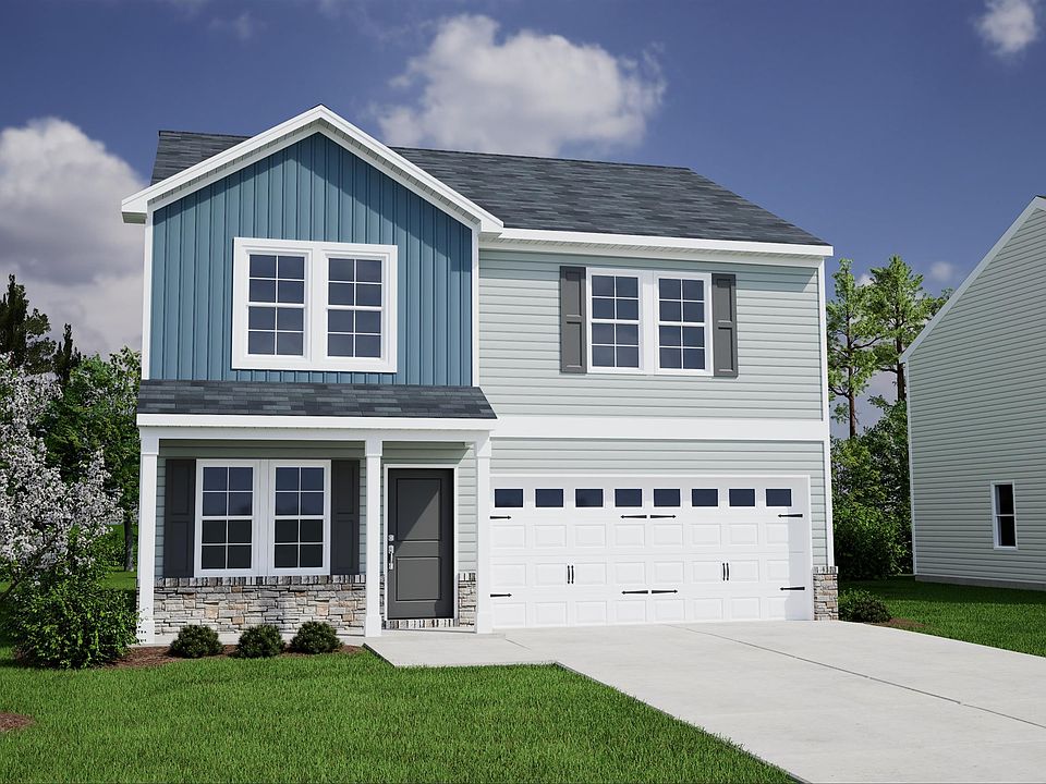 When you approach this home located in a cul-de-sac, you'll be impressed by its appearance. The stylish gray vinyl siding with blue accents complements the front stone beautifully. As you enter, you'll be welcomed by a versatile flex room, suitable for a home office, formal living room, and dining room. The kitchen boasts numerous upgrades, including white shaker-style cabinets, GE stainless steel gas appliances, and granite countertops. It overlooks the family room providing an open-concept feel. Upstairs you have a loft that will be the perfect place to curl up with a book. The spacious secondary bedrooms have plenty of closet space and share a hall bathroom. The primary suite has a vaulted ceiling, a large walk-in closet, quartz countertops, and a five-foot shower in the bathroom. Come visit Wingate today to see this beautiful home!