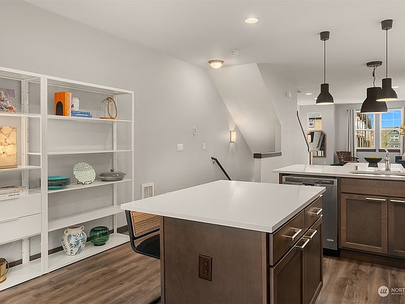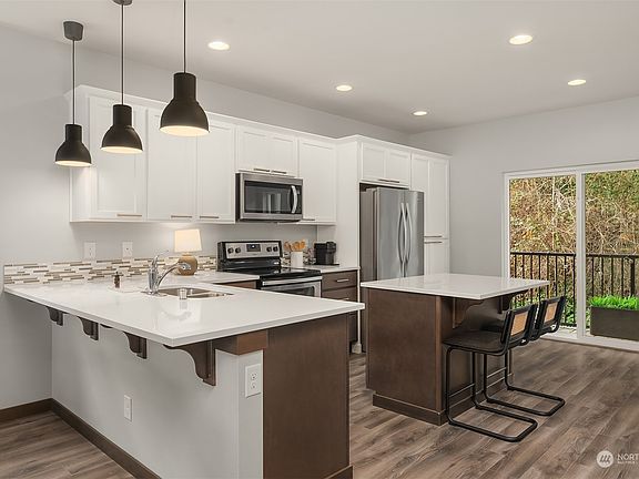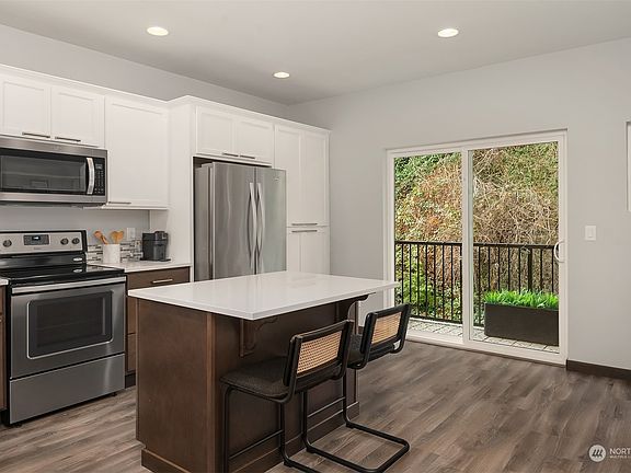 This impeccably maintained Sylvan Ridge townhome blends style and convenience! The wide-open layout shines with hardwoods, custom colors and lighting, beautiful kitchen with island seating—perfect for entertaining! End unit basks in light from three sides. Upstairs, more beautiful windows elevate the spacious primary suite with a luxe bath. Additional bedroom, full bath, and laundry round out this floor. The HUGE 2+ car garage offers storage or gym space, plus a driveway for extra parking. Nestled on a charming street, minutes from the Junction, Lincoln Park, shopping, dining, and the W Seattle bridge—this move-in-ready home is a must-see! Private deck and patio for outdoor living, with stunning backdrop of green space behind.