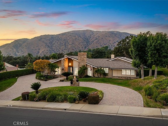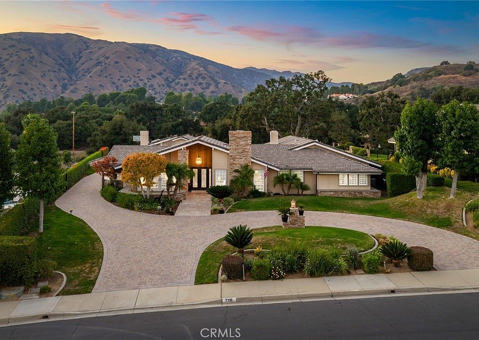 Custom California Ranch-Style Estate featuring a symmetrical façade, circular paver driveway, stacked-stone accents, and meticulousl landscaping. Double iron-and-glass entry doors opens to a light-filled interior framed by floor-to-ceiling windows and wood-trimmed architectural columns, leading seamlessly into the formal living and dining rooms. The living room offers a tray ceiling with crown molding, a fireplace, and windows overlooking the front yard. The dining room offers a mirrored coffered ceiling and French doors that open to a front sitting area. The kitchen features custom wood cabinetry, granite countertops, stainless steel appliances, bar-top seating, and a breakfast nook with a built-in desk area. The adjacent family room offers a dramatic fireplace framed in granite, exposed white trusses, and wood-plank ceiling that blends architectural character. French doors and wood-framed, grid-style casement windows provide views and a seamless transition to the backyard. This wing also includes a bathroom with shower, a laundry room, and access to the three-car garage. On the opposite wing, an executive-style office showcases millwork, coffered ceilings, floor-to-ceiling built-ins, and richly stained cabinetry. The luxurious primary suite is a sanctuary–oversized and appointed with tray ceilings, dual sets of French doors, tall windows, and dual walk-in closets. The spa-inspired en suite bath features a jetted tub set beneath stained-glass windows, a walk-in shower, dual vanities with granite counters, and a double-sided fireplace shared with the bedroom. Additional bedrooms include one with an angled tongue-and-groove plank ceiling, and another with a tray ceiling. The hall bathroom features granite countertops, a frameless walk-in shower, and a jetted tub. The private, resort-style backyard is designed for elevated living–an expansive outdoor retreat ideal for entertaining or everyday luxury. A sleek PebbleTec pool is the centerpiece, paired with a stacked-stone spa, dramatic fire bowls, and cascading water features. A covered cabana lounge with vaulted wood ceiling, recessed lighting, heaters, and drapery offers a year-round outdoor living experience. A built-in BBQ island with stainless appliances, a fire table, sail shades, and paver decking sits beneath a majestic oak tree with views of hillside vistas. The detached three-car garage sits beyond a private gated driveway, where a putting green adds the final touch to this extraordinary estate.