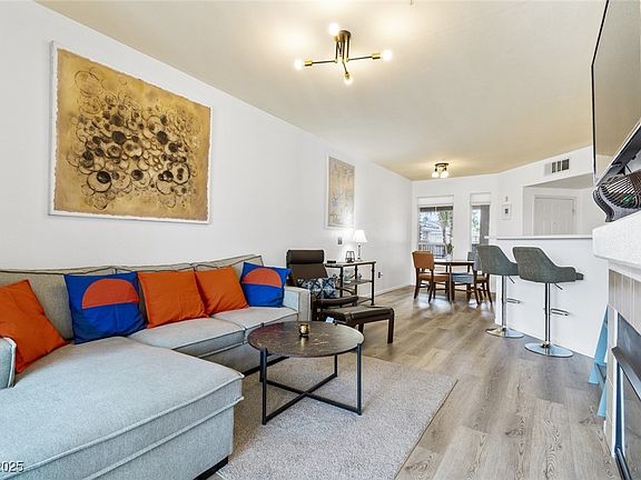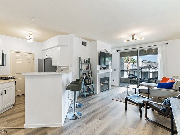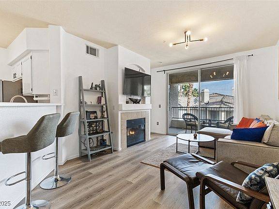 Stylish & move-in ready condo in excellent location! Inside this beautifully updated condominium you’ll find an open floor plan with two bedrooms, each with a walk-in closet, and two full bathrooms. The kitchen offers a breakfast bar and ample storage. Enjoy the gas fireplace on cozy nights or take in the community views from the covered balcony which offers a relaxing retreat. The refrigerator, washer, dryer, one wall-mounted TV, light fixtures, window coverings AND MOST FURNITURE included! The unit is located on the third level so there’s no upstairs neighbors. One covered parking space is also included. Vistana is a gated community with resort style amenities such as community pool, spa, fitness center, clubhouse and roaming security. Close to shopping, dining, Durango Resort & Casino, Southern Hills Hospital and IKEA. 15 minutes to Summerlin, Harry Reid Int’l Airport and the Las Vegas Strip.