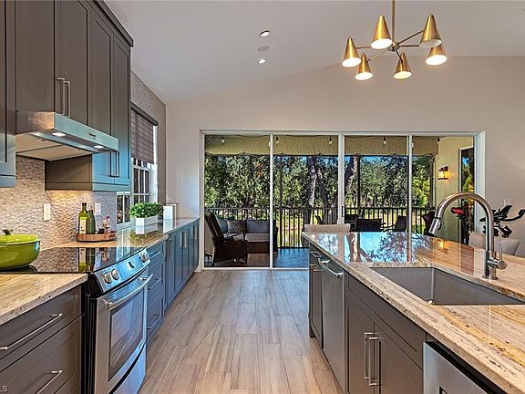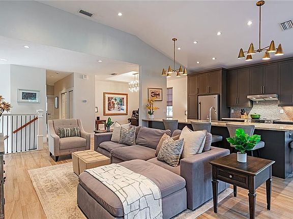 Sophisticated lakefront coach home with designer upgrades throughout. This beautifully updated second-floor residence features a spacious, open floor plan with soaring ceilings and Spanish porcelain wood-look tile, creating a light-filled, elegant living space. The renovated kitchen is reconfigured for modern living and offers an expansive breakfast bar, granite countertops, custom Busby cabinetry, and stainless steel appliances. Sliders open seamlessly to a screened lanai overlooking the lake. The primary suite boasts a walk-in closet and a luxurious updated bathroom with dual sinks, a frameless shower, and separate soaking tub. Two generously sized guest bedrooms share a beautifully appointed guest bath. Attached one-car garage. Located just minutes from Waterside Shops, beaches, and dining, this home is in the sought-after, gate-attended community of Autumn Woods, where residents enjoy 26 acres of lush preserve, swimming pools, spa, tennis and basketball courts, a playground, fitness center, and two activity/meeting rooms.