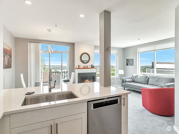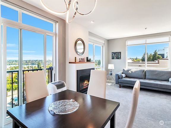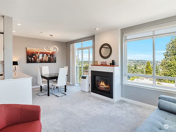 BIG GREENLAKE, MOUNTAIN & SUNRISE VIEWS! Vibrant Phinney Ridge 'hood. Top floor, end unit facing southeast, gas frpl. Open kitchen w/quartz countertops, fab KitchenAid Stainless package inc gas range. Primary bdrm enjoys sunrise views but has blinds & blackout shades. Walk-in closet with closet system & all new primary bath featuring porcelain tile floor, full tile shower, new vanity with quartz countertop, sink, fixtures, lighted mirror & bidet-ready toilet. Main bath has new vanity, fixtures, mirror & toilet. Custom shades & blinds throughout. Large, private rooftop deck. Secure garage has 2 parking spaces, bike storage & storage unit. Secure elevator building w/lobby. Your own private rooftop deck great for the urban gardener.