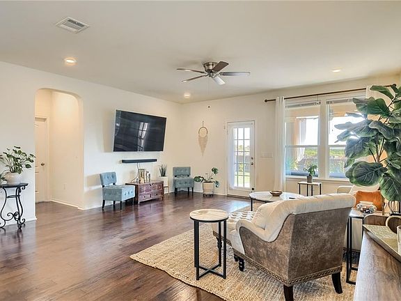 You'll love this bright and spacious single-story home located in Vista Point. You are welcomed by a cozy front porch, such a great space to spend time in a rocking chair. Tons of upgrades by the builder include hardwood floors throughout the living areas and owner's suite, a beautifully updated kitchen with quartzcountertops, stainless steel appliances, and beautifultile work in the wet areas. Secondary rooms are separatefrom each other and theprimarybedroom,allowing for tons of privacy for your kids or guests. The primarybedroom has dual closets with built-in shelving to maximize space and organization. The ensuiteincludes dual vanity, walk-in shower, and you'll love the jetted tub. The open dining and living areas look out over the covered patio that extends along the back of the house and includes built-in countertops and a grill. Out back you have amazing big sky views, a great size yard for gardening, or letting thelittles run wild. Don't miss the fully finished garage with a sink for cleaning up after working or for washing the pets.