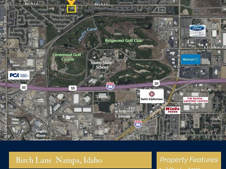 Excellent small development project close to the Idaho Center and Freeway access. 3 acres with all utilities at street with 256 feet of frontage on Birch Lane or connect at back of property in neighboring subdivision. City is open to Zoning of RD, R-4 or R-6 which would allow duplex, townhomes or lot sizes at 6,000 sq ft or greater; NO multifamily or high density currently as options.
