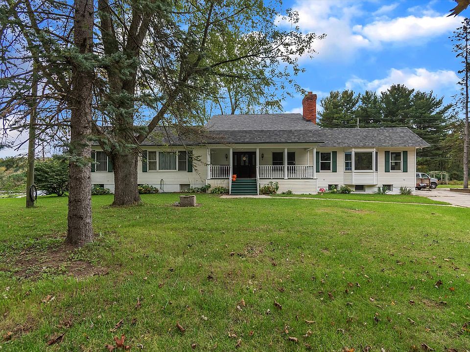 Country Living close to conveniences with 6 acres, full front porch and covered back porch overlooking rolling acres with red barn! 1.5 story farmhouse attached to a ranch one story used as in-law quarters- built in 1984. All appliances remain. Natural brick fireplace in living area greets all upon entry! 4 car garage with direct access. Basement is partly finished. Newer roof 2+ years old, newer natural gas furnaces 6+ years. Newer wood laminate in Living Room. Nice bay windows have views of the 6 spacious acres. With the square footage, there is loads of potential! Seller offering it for sale As Is. All data & measurements to be verified by buyer.