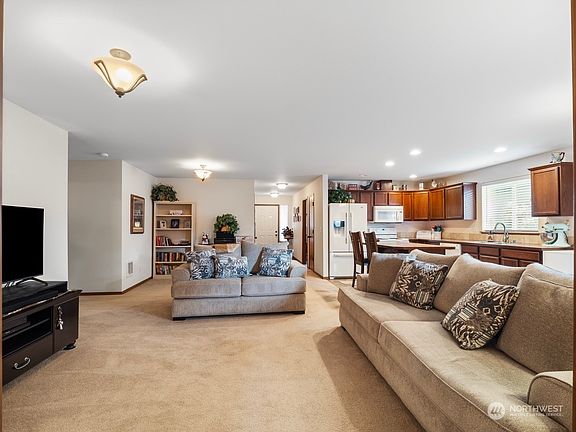 Discover this charming one-level home in the desirable Holland Glen community! Featuring an open floor plan, spacious kitchen with an island and ample counter space. All appliances included. Enjoy three bedrooms, two bathrooms and the comfort of air conditioning.  Primary suite has a large walk-in closet. The fully fenced backyard is perfect for gardening, while the large deck with a retractable awning offers a great space for outdoor relaxation. A two-car garage provides plenty of storage. New hot water heater in 2024. Conveniently located near JBLM, with easy access to a community park and nearby walking trails. Don't miss this fantastic opportunity!