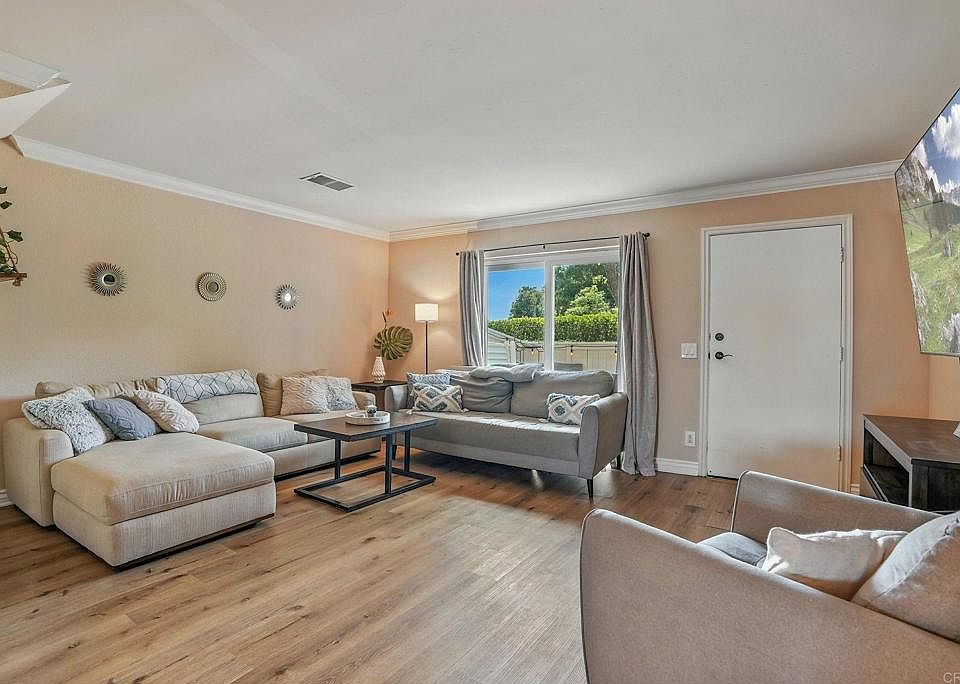 VA Financing Approved...Rarely available model townhome perched at the top of Quail Ridge offering 2 ensuite bedrooms, 2.5 baths, and 1,210 sq ft of comfortable, low-maintenance living. Entry-level features include a spacious living area with LVP flooring, a private patio, and a granite-appointed kitchen with travertine floors, stainless steel appliances, and a newer dishwasher. No steps to the front door, dual-pane windows, air conditioning, and an oversized one-car garage with storage and workbench. Enjoy a peaceful greenbelt entry, unlimited guest parking, and easy access to the community pool, spa, and clubhouse. Ideally located just 6 miles from the beach, minutes to shopping, dining, and major routes. VA approved and move-in ready!