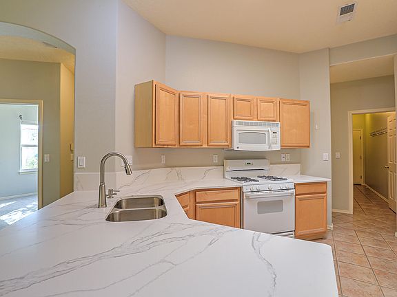 Stunning home in a gated community. Upgrades and upscale features include new quartz countertops (2024), new carpet (6/20/2024), new interior paint (2024), refrigerated air, 9ft and 10ft ceilings throughout the home. Gas fireplace in the living room. Custom tile showers (low profile in the primary suite), and many new light fixtures. The kitchen features Calacatta Quartz, generous cabinet space, a pantry, and appliances that stay. The no fuss backyard features trees, shrubs, flowers, and gravel. Driving through the neighborhood you will notice a gated entrance, and a small community, Spanish tile on the roof, and a big club house for residents. Homes and streets are well lit at night thanks to automatic flood lights above garage door. Centrally located, close to Intel.
