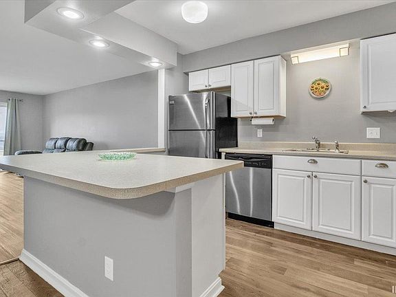 Enjoy a ground floor, open concept unit with great views of Thunderbolt Pass golf course from your 6x11 covered back deck on Evansville's beautiful North side. This location boasts a secluded feel complete with sightings of turkey and deer. The kitchen has been updated (2015) and offers a wrap-around breakfast bar with ample counter and cabinet space, updated stainless steel appliances (2015), and is open to the dining room. There is new LVP (2024) flooring and an updated sliding patio door (2020) in the large living room. The bedroom and hallway have new LVP floors, and the the bathroom was updated with a tub/shower surround, vanity, and solid surface top (2015). This unit has several closets and a large 4x6 walk-in closet that could be converted to a laundry room. The unit has updated paint, new AC (2022), new water heater (2023), furnace (2013), and roof (2020). The HOA fee is $217/month and includes water, sewer, trash, basic cable, snow removal, and common area maintenance. No pets allowed. Also included is a covered parking spot, locking mail box, contained trash room, and pay laundry facility on floor 2 by the private storage unit. No pending assessments.