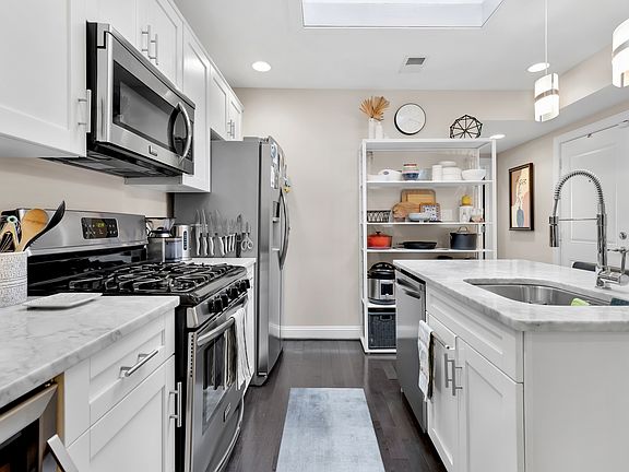 Inside, you'll find a renovated gourmet kitchen with granite countertops, stainless steel appliances, a 5-burner gas range, and a wine coolerperfect for weeknight cooking or hosting. The home also features hardwood floors, a skylight that floods the space with natural light, and a fireplace for cozy evenings.
