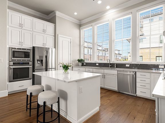 Experience modern living in the heart of the vibrant Las Colinas Urban Center with this beautifully finished and meticulously maintained residence at the Townhomes at Lake Carolyn. Nestled just steps from Lake Carolyn, Levy Event Plaza, Campion Trail, Irving Water Street, Toyota Music Factory, Opitz Park, and more, this home offers the perfect blend of convenience, walkability, and luxury. This multi-level townhome features an open-concept layout with extra-tall first-floor ceilings—unique within this community—and an impressive 12 ft ceiling height on the main living level. Oversized windows fill the space with natural light, complementing the spacious kitchen appointed with contemporary cabinetry, quartz countertops, an upgraded Thermador appliance package, and an oversized island ideal for entertaining. Built-in shelving enhances the living area with both function and architectural appeal, while stylish engineered hardwood flooring and a timeless neutral color palette carry throughout. A new HVAC system installed in 2025, combined with Eco-HIP construction, contributes to energy efficiency and year-round comfort. The private primary suite offers a peaceful retreat with a generously sized bedroom, high end bathroom, and spacious walk-in closet. Two additional bedrooms with en suite bathrooms provide flexible space for guests, home office use, or media needs. Enjoy outdoor moments on your balcony or terrace, or step into your small fenced front yard—perfect for pets. From your doorstep, explore miles of waterfront paths, the DART rail station, and some of the area’s best dining, shopping, and nightlife—all just minutes away. With low-maintenance living and unbeatable access to everything Las Colinas has to offer, this townhome delivers the ideal urban lifestyle and truly shows like new.