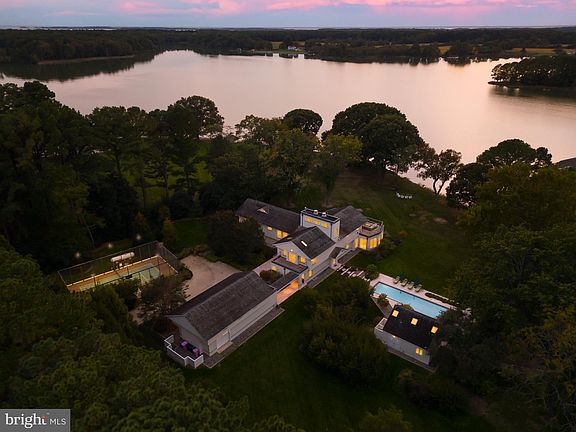 This sophisticated, elegant modern home has been designed and built to an exceptional quality level with every feature and amenity that your family would desire. Located just 10 minutes from Historic St. Michaels this property is truly a coveted offering that is being sold fully furnished! The very private, well elevated, west facing property offers gorgeous sunset views, lush landscaping, deep water, a rare boat house, a beautiful 50-foot pool, extensive limestone hardscaping, a well-appointed pool house, a lighted sport-tennis court, cedar siding and a 3-car oversized garage. This tasteful home was custom designed by Paul Rovinelli, a prominent Boston architect and built by Ilex Construction who are known for their quality craftsmanship and attention to detail. The design takes full advantage of the spectacular water views from all 5 bedrooms and the spacious family room. The captivating 7,100 sq. ft. interior features quartersawn white oak hardwood flooring, walls of windows that bring the outdoors in, soaring ceilings and extensive built-ins. A beautifully landscaped courtyard with limestone paved entry greets your arrival to the breathtaking open interior flooded with light and limestone foyer. On the main level there are two spacious guest rooms with a full bath located in a separate wing. The gourmet kitchen with bar seating, beautiful Brazilian Nero Marinace granite counters and top of the line appliances is truly captivating. A spacious family room with walls of glass is located on the waterside and features a double-sided fireplace that is connected to the large dining room. An adjacent three season room opens to the family room via a movable folding glass wall. Designed for entertaining, the home features a den/media room ideal for movie viewing and a spacious TV/recreation room for hanging out. The sculptural staircase leads you to the second level and there is an elevator as well. An upstairs sitting room with fireplace leads you to a separate wing with two additional large guestrooms and full bath that feature waterside IPE balconies, vaulted ceilings and built-ins. The upstairs laundry room features the convenience of a dumb waiter. A spacious office with outdoor IPE balcony, extensive built-ins and closet space is located on the opposite side. The spectacular primary bedroom features a cathedral ceiling, a fireplace, substantial built-ins, a spa like bathroom and an expansive waterside IPE deck. The mechanicals are of the quality that one would expect in a home of this caliber. The main house has a geothermal HVAC system, radiant floor heating throughout, a back-up generator, and a fire-suppression sprinkler system. The grounds are fully irrigated, and the site design utilizes a sub-surface French drainage system with river rock that eliminates the need for gutters. The beautifully landscaped grounds feature limestone patios for entertaining, a dock with 6’ MLW depth, a boathouse with mechanical lift, two jet ski lifts and two floating docks. The pool complex is just amazing and features a recently refurbished 50-foot heated lap pool, a limestone patio and a pool cabana with kitchen, bathroom, and outdoor shower. The 3-car oversized garage is connected to the main house by a breezeway and features a large storage loft. The lighted platform sport-tennis court completes this amenity-rich offering. This very special waterfront property offers uncompromised quality, beauty and features that will surely delight your family and guests. **Click on movie camera icon for link to video tour, photo tour and floor plans.