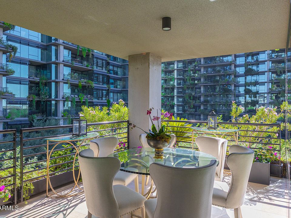 Perched on the south side of the iconic coveted 7120 tower, this 1,535 SF 2-bedroom, 2.5 bath condo lives like a modern treehouse suspended above Scottsdale's most vibrant corridor. Floor-to-ceiling walls of glass frame sweeping green space views and dapple the interiors with soft natural light year-round. Step onto the oversized balcony - your personal floating garden wrapped in mature oleanders, orchids, and pink bougainvillea - the perfect spot for morning coffee or sunset cocktails among the birds.