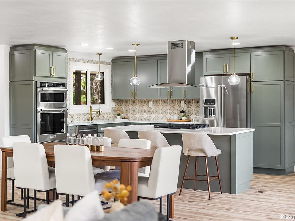 Experience timeless elegance and modern luxury in this updated 5-bedroom, 3-bath residence located on a corner lot in the heart of the Columbine Knolls community. Thoughtfully redesigned with premium finishes, this home is a standout from the moment you arrive. Inside, you’ll find beautiful luxury vinyl plank flooring that spans the open and inviting main level. The designer kitchen is a true culinary masterpiece, featuring sleek quartz countertops, an island perfect for entertaining, custom full-height cabinetry, oven, gas cooktop, range hood, microwave, dishwasher, and a refrigerator. Flowing seamlessly into the dining area and spacious living room, this open layout is ideal for gatherings.