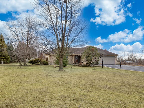 Discover the perfect blend of space, comfort, and country charm on this 5 +/- acre professionally landscaped property, featuring mature apple and pear trees. This exceptional home includes a HUGE 46'x54' pole barn and a traditional Amish barn, providing endless possibilities for storage, hobbies, or farming. Step inside to a bright and spacious living room, highlighted by a large picture window that fills the space with natural light. The adjoining dining room features a modern light fixture, leading into the expansive eat-in kitchen with granite countertops, stainless steel appliances, and a cozy breakfast area. The kitchen opens to a warm and inviting family room, complete with a brick fireplace and French doors leading to the patio-ideal for indoor-outdoor living. By the entry, a private den with double doors offers the perfect space for a home office, study, or additional lounge area. This home offers four generously sized bedrooms, including a primary suite with a walk-in closet and private bath. A hall bath serves the additional bedrooms, ensuring ample space for family and guests. The lower level features a wet bar, recreation room, and a theater room, perfect for hosting gatherings or relaxing at home. Enjoy peace of mind with a newer Generac backup generator and recent updates, including a whole-house water filtration system (2025), boiler (2024), water softener (2023), carpet - upper level (2023), and attic re-insulated (2023).