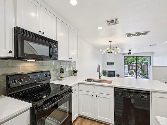 Beautifully updated from top to bottom, this townhome is truly the best value in this gorgeous, well-maintained gated complex set in a park-like setting with mature oaks and lush landscaping—right in the heart of Austin. Every detail has been refreshed, including kitchen & bath cabinetry, black matte hardware, quartz counters, designer backsplash, modern double farm sink, black appliance package, new doors, fireplace redo, stylish fixtures & recessed lighting and paint!!. Gorgeous new wide vinyl wood-plank flooring runs throughout, highlighted by reclaimed-wood stairs for a custom touch. The open layout offers a modern walk-in pantry, built-ins, abundant storage, and a standard-size washer and dryer. Upstairs, the spacious primary suite features vaulted ceilings, a large double-sink bathroom, and a private balcony. The secondary bedroom also boasts vaulted ceilings and abundant natural light. Relax outdoors on the oversized paved patio or enjoy the community’s resort-style pool and spa surrounded by mature trees and beautifully grounds. HOA dues cover exterior maintenance, landscaping, and more—offering true peace of mind. Conveniently located near top schools, shopping, restaurants, and major highways, on Metro bus stop,and just 10 minutes from Downtown Austin. Seller is including a home warranty and up to 3 months of HOA dues with purchase. Move-in ready and unmatched at this price!