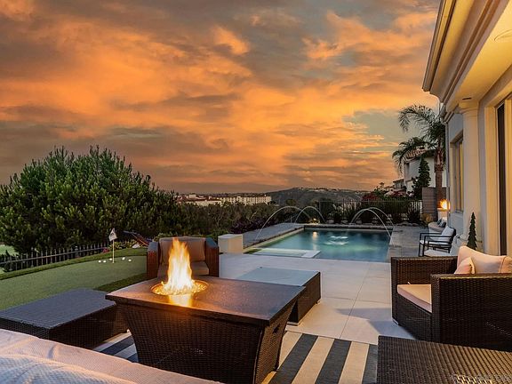 Located in the highly sought out gated community of Aviara Point, this custom-built home offers incredible 180° views of the Aviara Golf Course and surrounding mountains! The home blends comfort, privacy, and functionality in a peaceful and scenic setting. The private backyard is an entertainers dream that includes a pool with electric cover, spa, fire pit, putting green, built-in BBQ, and even an outdoor shower —all surrounded by lush landscaping and open views of the 7th hole. Enjoy California’s indoor/outdoor living at its finest! As you step inside the home, you’re welcomed by a light-filled entry with high ceilings and a sweeping staircase. The open-concept great room features large windows that frame spectacular views, while the gourmet kitchen is fully equipped with stainless steel appliances, double ovens, built-in fridge, and a large center island —ideal for both everyday living and grand entertaining. The layout includes two spacious downstairs suites with private entrances—perfect for guests, multi-generational living, or private maid's quarters. Upstairs, the luxurious primary suite offers a sitting area with fireplace, spa-inspired bath with Jacuzzi tub, large walk-in shower, dual walk-in closets, and beautiful wood french doors opening to a private balcony with endless views. Three additional en-suite bedrooms down the hall ensure comfort and privacy for all. Additional features include: dual-zone heating and air conditioning, extensive use of travertine and crown molding, an advanced security system, multiple home office spaces, and a spacious three-car garage. This home offers a rare combination of luxury, privacy, and scenic beauty in one of Carlsbad’s most desirable gated communities!