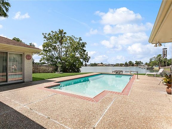 What a view! Bask in the sun while swimming in your inground pool and relaxing on the lake! This one has it all! This home offers loads of parking, a gated entrance for added security and an open floor that allows for lake view from the kitchen, den, liv rm, din and primary bedrm. Upon entering into the lg foyer, you have an adjoining liv and din rooms w/ wetbar for entertaining. Kitchen w/ stainless appli and spac break area overlook the den w/ frpl. The primary bed has dbl sinks, jacuzzi, tile surround and walk in closet. Extras incl alarm, fountain, 1/2 ba and sink in rear off pool, new pool pump, cov patio, pool dock. All appliances remain.