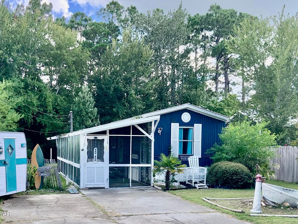 A RARE FIND in FL...NO HOA! N0 LOT RENT! Own your lot! In PCB ....also in the county. Chickens permitted! A small brook and wooded area run across the back of the lot. Also has a small out-building. A screened porch runs the length of the home in front. There is a ramp at the back door. Make this your quiet beach retreat, or your home. It is clean, quiet, and move-in ready!