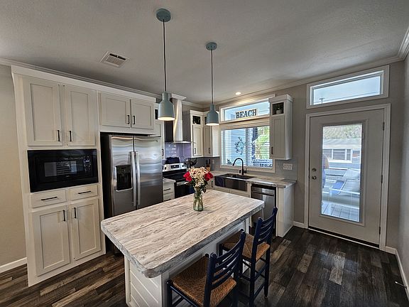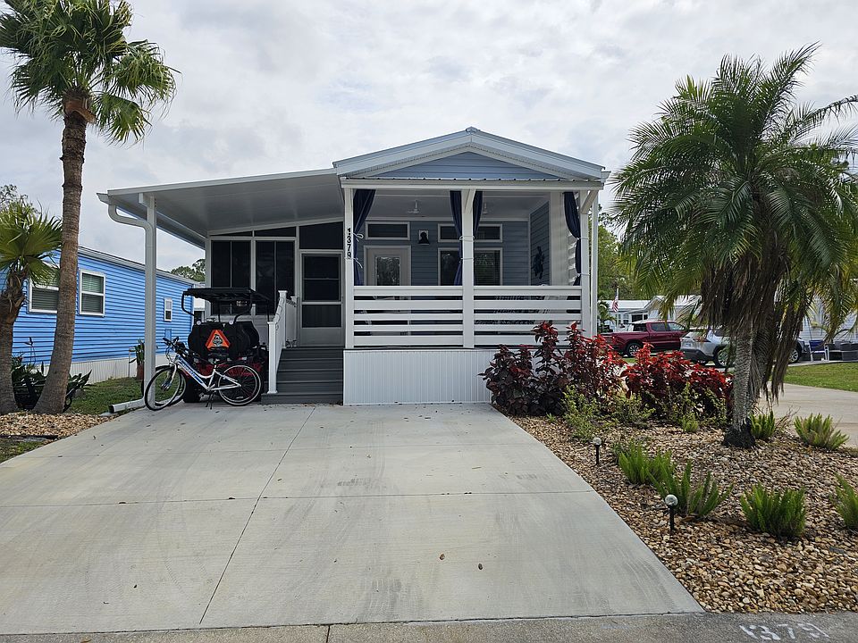 This stunning Lake Charles model is sure to impress! Enjoy relaxing evenings on the charming covered front porch, complete with an electric fireplace. Inside, the open floor plan features a front-facing kitchen with a spacious island, brand-new appliances, beautiful cabinetry, and a farmhouse sink. The primary bedroom easily fits a king-size bed, while the bathroom boasts a walk-in shower for added comfort. The extended lanai offers additional covered parking, blinds for privacy, insulation, and both heating and cooling. It also includes a washer and dryer, a convenient half bath.Don't miss out on this incredible home!
