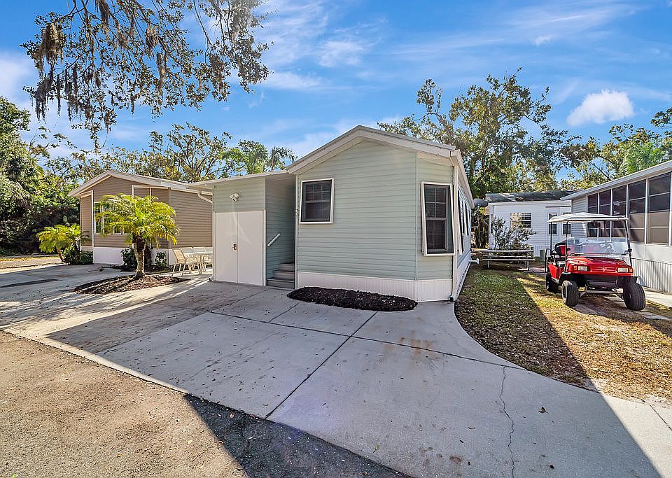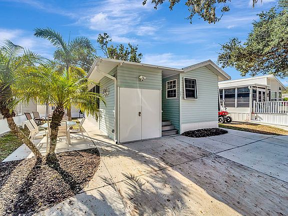 Welcome to this beautifully upgraded Cutlass park model on Lot 731, located in the heart of the highly sought-after Sun Outdoors Sarasota community. This move-in-ready home is designed to offer comfort, style, and ease—perfect for snowbirds, seasonal residents, or anyone dreaming of the Florida lifestyle. Inside, you’ll find two cozy bedrooms with queen beds, including a primary suite featuring a premium Sleep Number bed with motorized head and foot lift. The home’s inviting interior feels open and airy thanks to warm paneling, elegant glass-paneled saloon doors, and ceiling fans in every room. A heated and cooled raised lanai, newly constructed in 2014 and equipped with beautiful top-down/bottom-up shades, provides an additional living area that’s ideal for relaxing, dining, or entertaining. Modern conveniences such as a new dishwasher, new washer and dryer, a La-Z-Boy electric reclining sofa, smart locks, and an exterior Ring camera make daily living simple and enjoyable. A durable steel roof and a street-facing golf cart garage with ample storage further enhance the home’s appeal.