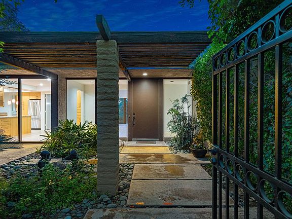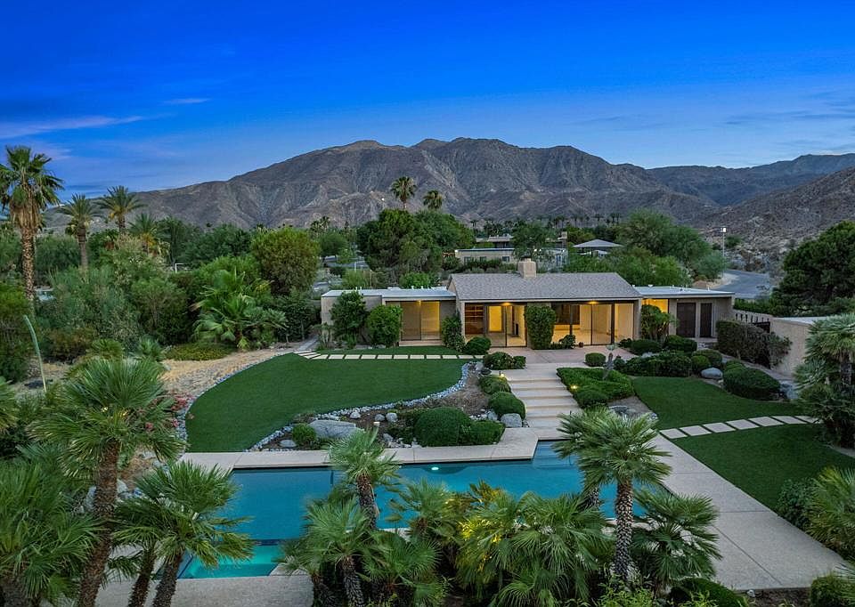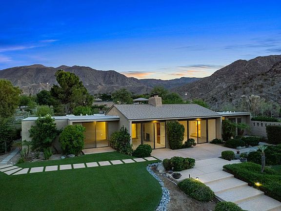 Discover your dream home nestled at the base of the Santa Rosa Mountains in Rancho Mirage. This exquisite property, a combination of two lots set on over an acre, is situated across the street from the mountain preserve with direct access. Built in 1975, this mid-century modern residence combines Spanish architectural elements with stucco and slump block construction. This stunning property is the former private residence of celebrated landscape architect John Krabbe, known for designing many notable residences throughout the Coachella Valley, including prominent homes of Marvin Davis, William Holden and the Nordstrom family. The home offers 3 bedrooms, 2 bathrooms, and an additional 3/4 bath off the recently refinished outdoor PebbleTec pool. Expansive floor-to-ceiling glass windows along the north exposure of the home flood the interior with natural light. Freshly updated with new carpet and paint. Step inside to find a spacious living area with a step-down living room featuring a double-sided fireplace, also visible from the cozy den with large built-in custom bookshelves. The primary bedroom boasts a generous walk-in closet and an ensuite bathroom with a step-down, sunken bathtub and separate shower. Each room in the house opens directly to outdoor living spaces, with an exterior that is just as impressive with mature landscaping, a circular driveway and a renovated 2-car detached garage with a separate rear driveway