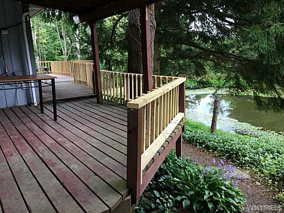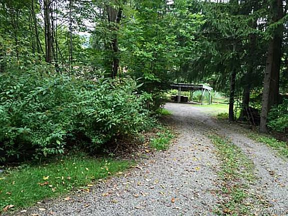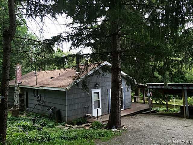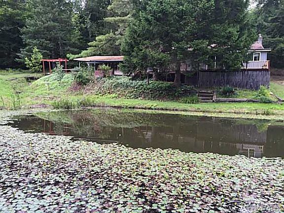You will feel like your are on vacation everyday in this rustic 2 bedroom home tucked in the woods on almost 2 acres. Nice snack bar in galley kitchen. Lg sunlit dining room w/WB stove and slider to yard. Breakfast rm overlooks pond. Huge living room features stone WBFP. 2 bedroom w/closets. Sit on covered deck & relax while nature surrounds. Covered bridge over creek. Shelter. 2 car garage plus workshop w/woodstove. New septic being installed. Updates include: windows, furnace, HWT, well pump. "Just over the hill from Kissing Bridge". By appt only. Please do NOT walk property w/o permission.