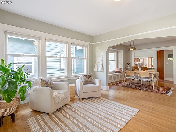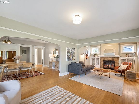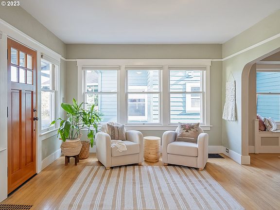 With all the craftsman details, a spacious living area, and an updated cook's kitchen, this bright vintage bungalow will leave you impressed. Sunlight pours in through more than 25 windows in this well-lit craftsman. Don't overlook the very versatile office / sun porch / bonus room; it is absolutely lovely! The large living area features built-ins and a cozy wood-burning fireplace. The formal dining room has a built-in window seat and a buffet/breakfast bar. The two generous bedrooms each come with vintage craftsman closets featuring mirrored doors. Hardwood floors and stylishly updated schoolhouse light fixtures in every room. Enjoy the outdoors on the inviting front porch or the massive back deck in the fenced, private, low-maintenance backyard. The 551sf oversized garage includes an enormous shop/workbench/storage area, perfect for all your gear, tools, and hobbies, -enough room for a 2nd car! The spacious basement boasts high ceilings and provides additional square footage if needed. Updated systems and an extremely convenient and quiet location complete this lovely home. [Home Energy Score = 5. HES Report at https://rpt.greenbuildingregistry.com/hes/OR10222893]