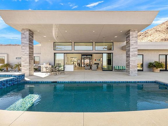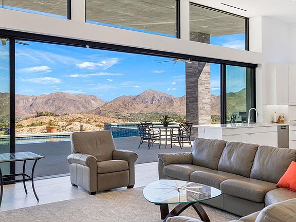 The "magic house" sits on a private gated 2.5-acre parcel in the custom home community of Cahuilla Hills. This property sits alongside conservancy land offering incredible unobstructed mountain views and access to hundreds of miles of hiking from the property. The painted desert skies and desert landscapes are truly magical and land this parcel as one of the best view lots in all of Cahuilla Hills. Additionally you can view the meticulously maintained private stone eagle golf course from the back door. This extraordinary property offers elevated desert living, with the modern contemporary style and quality craftsmanship of eco- friendly solar-powered estate. This is a 5 bedroom and 4 bath home, plus a bonus room off the master for workout equipment or office space. This custom home is a perfect full time residence or seasonal home with profitable vacation or party rental potential. Thoughtful details have been incorporated in the design of the house from the jaw dropping room size walk in Grohe rain shower in the master, to the Linear diffusers in the ceiling to equally distribute air flow throughout, whole home water purification system, this home is comfortable, luxurious and thoughtfully designed smart home. The indoor-outdoor kitchen is equipped with Thermador appliances, and floor to ceiling doors that open to incredible desert views below. The striking design creates seamless flow between indoor and outdoor spaces. This home boasts a beautifully epoxied 4-car garage with ample space for your vehicles and toys. This property includes an additional building pad already graded and ready for your customization in additional structures or to create an epic outdoor playground with sports courts, The sky's the limit with the opportunities that await at the magic house. Offering breathtaking views, architectural elegance and modern luxury yet a short 4 mile drive from your private desert sanctuary you can be downtown El Paseo shopping and dining or taking in a show at the theater, you are within close reach of all the desert has to offer.