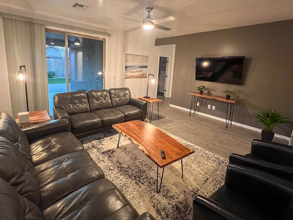 Fully Furnished, utilities included. Newly remodeled 3 Bedroom House. Sleeps 6. King Bed in Master, Queen bed and 2 doubles. Appliances including washer and dryer. Internet access included. 4 miles away from Loop 202 (South Mountain Freeway). Gated community. Gas stove.