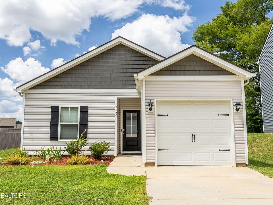 Finally you've found what you've been looking for! Discover this exceptional four-bedroom, two-bathroom home at 7129 Dusty Rose Lane, perfectly positioned on a quiet cul-de-sac in desirable West Knoxville. Built in 2023, this affordable one-owner residence offers modern comfort and thoughtful design throughout its move-in-ready interior.Step inside to experience the seamless flow of luxury vinyl plank flooring that extends throughout the home, providing both durability and effortless maintenance. Nine-foot ceilings create an airy, spacious atmosphere that enhances every room's natural appeal. The heart of this home features a well-appointed kitchen designed for both everyday living and entertaining. Granite countertops complement stainless steel appliances, while the gas range and oven provide precise cooking control. A convenient pantry offers ample storage, and the kitchen island serves as both a workspace and gathering spot for family meals. Natural light floods the open family room, creating a bright and welcoming environment that seamlessly connects to the kitchen area. This thoughtful layout promotes easy conversation and interaction between spaces. The home's four bedrooms provide flexible living options, with one room ideally suited for use as a home office, study, or playroom if desired. The primary bedroom suite stands as a true retreat, featuring a generously sized walk-in closet and an elegantly appointed ensuite bathroom that offers privacy and comfort. Outside, the level and spacious yard provides endless possibilities for outdoor activities, gardening, or simple relaxation. The property's cul-de-sac location ensures minimal through traffic while maintaining easy access to neighborhood amenities. Modern conveniences enhance daily living throughout this well-planned home. A tankless water heater provides endless hot water while maximizing energy efficiency.