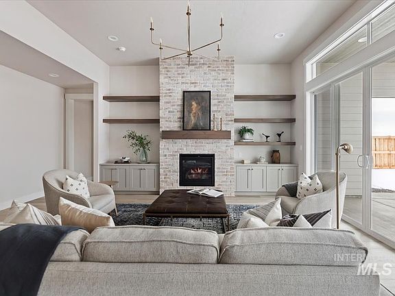 Welcome to the Chelsea, a beautifully designed single-level home featuring three spacious bedrooms, two and a half baths, and a split-bedroom layout for added privacy. The open floor plan connects the kitchen, dining, and living areas, creating an inviting space for gatherings. A floor-to-ceiling brick fireplace adds warmth and elegance to the living room, making it the perfect focal point for the space. The covered patio extends your living space outdoors, offering a serene retreat. Located in Pinnacle Southeast in Meridian, this home offers a peaceful setting with convenient access to local amenities. Photos are exact