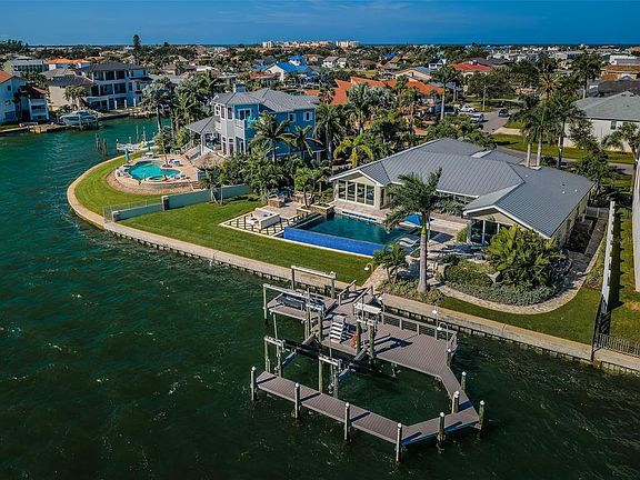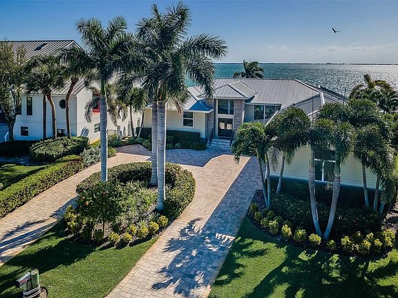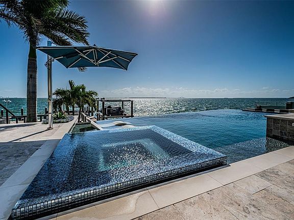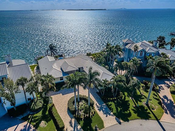 THIS REMARKABLE 4 BEDROOM LUXURY RESIDENCE, WITH ITS IMPRESSIVE 170FT OF SEAWALL AND ASTOUNDING BACKYARD BOATING, DINING AND RECREATIONAL PARADISE, DELIVERS MAJESTIC OPEN WATER VIEWS OF THE SUNSHINE SKYWAY BRIDGE. Lushly landscaped with a finely-pavered circular driveway, rich flatstone exterior finishes, 14ft-high covered entry and 15ft high foyer, welcome to a residence with dazzling unobstructed waterviews that span the width of this amazing home. A grand great room plan features 12ft-high vaulted ceilings, built-in entertainment center and surround sound. The exquisite chef’s kitchen boasts a wonderful island bar with beverage chiller/prep center, high-quality stainless-steel appliances including Subzero refrigeration, a custom pass-thru storage hutch, elegant granite surfaces/backsplash areas and extensive cabinetry storage. You’ll love the family room and its sweeping views of the waterfront. The gorgeous owner’s suite offers incredible water views, two roomy walk-in closets with closet systems, a private waterfront deck and dedicated access to the pool deck. Your owner’s bath is a pampering retreat with luxe free-standing soaking tub, glass-enclosed rain-shower with multiple shower heads, and two superb quartz vanities with a matching built-in linen/dresser. Second and third bedrooms are generously-sized with fine closet systems, while the second and third full baths are both gracefully in their appointments and tastefully-finished. The 4th bedroom is set up as an executive office with exceptional built-in furnishings. Step out back to a rare waterfront spectacle: The 370sqft covered lounging deck transitions to a stunning Pebbletec infinity pool/spa with in-pool lounging area and specialty waterfall effects, and built-in Tucci SS umbrella. Thick travertine pavers meander throughout the deck and sitting areas. The built-in luxury outdoor gas kitchen supports a dedicated built-in pool bar. Built-in gas firepit is complemented by a large built-in seating area. The composite boat dock setup is truly incredible, with 30K lb boat lift (accessible from three sides), 7K lb dual jetski platform lift, step-down area for kayak/paddleboard launch, mooring for a deep water cruiser, and extensive lighting, power and water. The list of features/capabilities of the outdoor waterfront area of this home make it an entertainment marvel. Exquisite marble floors, lavish woodworking, splendid specialty window treatments, whole-house water filtration/softening system, central vacuum, whole-house backup gas generator, extensive landscaping, 3 car garage with built in cabinetry and so much more. This is a magnificent home and extraordinary waterfront living experience in one of Florida’s best waterfront and boating communities. Dimensions are estimates, buyer to verify.