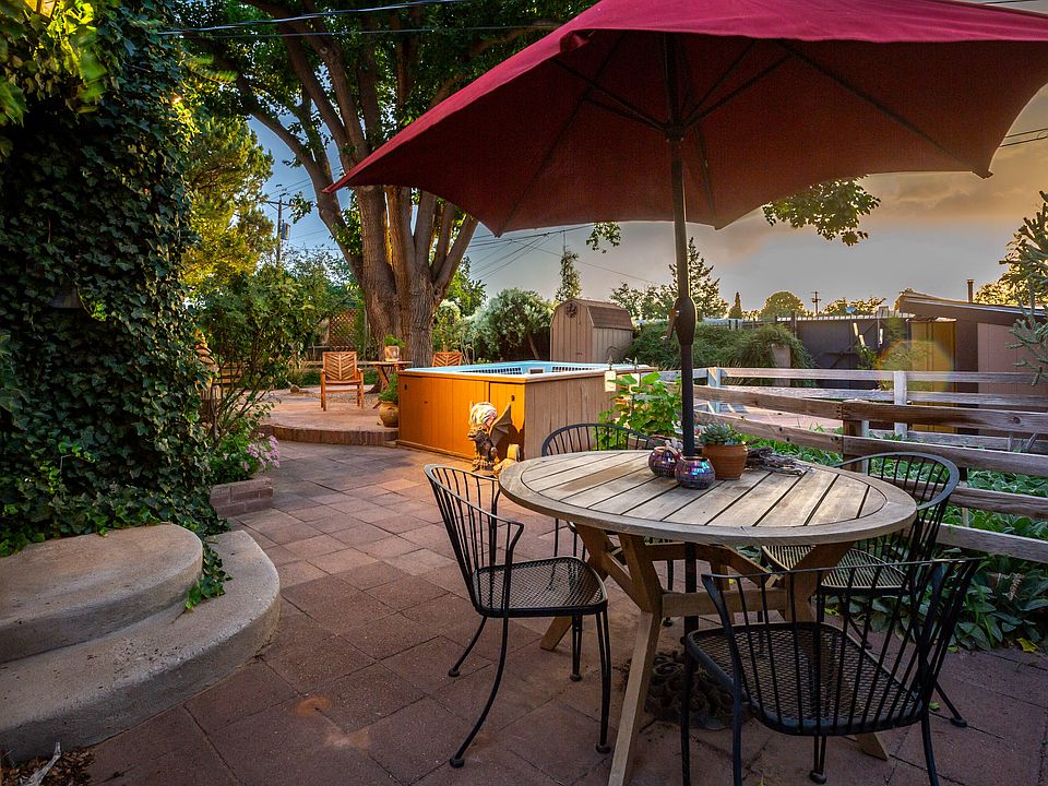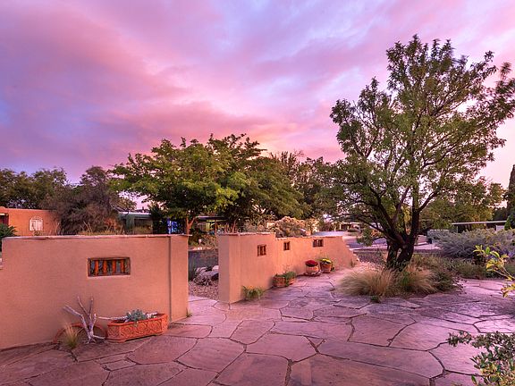 Treasured gem near Kirtland & Sandia Labs. Quality materials including, beautiful 3/4'' hardwood floors, pecan paneling in cozy sunroom, passive solar enclosed front porch, thermal windows, antique accents: cherry fireplace mantle w/marble surround. Custom antique vanities in the two bathrooms, italian tile, & hall bath w/ jetted tub & cstm barrel arch. Four bdrms with split primary bdrm that includes large walk in & en suite 3/4 bath w/Italian tile & ceramic sink. Open updated kitchen, wrap around breakfast bar, Corian counters, updated appliances w/ 5 burner gas stove. Skylights & solar tubes t/o for great natural light. Roof replaced in 2020, water heater & evap replaced. Bckyrd oasis w/hot tub & shade tree, pavers t/o & storage, alley access with protected wrought iron gate.