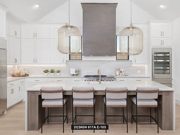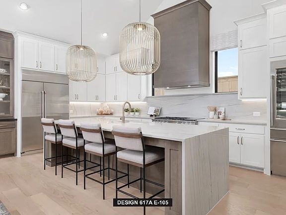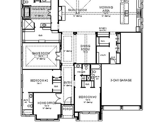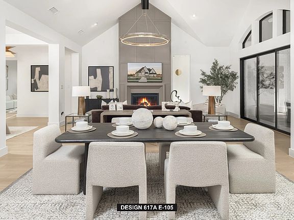 Home office with French doors set at entry. Formal dining room and game room with French doors frame extended entry. Family room with a decorative beamed ceiling, sliding glass door and fireplace opens to morning area and kitchen. Kitchen hosts elongated island with built-in seating space. Primary suite includes bedroom with wall of windows. Dual vanities, freestanding tub, separate glass-enclosed shower and large walk-in closet in primary bath. All secondary bedrooms feature private baths. Soaring ceilings and large windows add to this generous four-bedroom design. Extended covered backyard patio. Mud room leads to three-car garage.