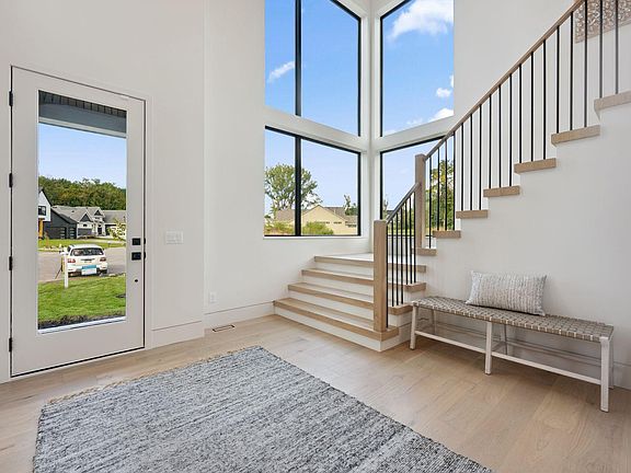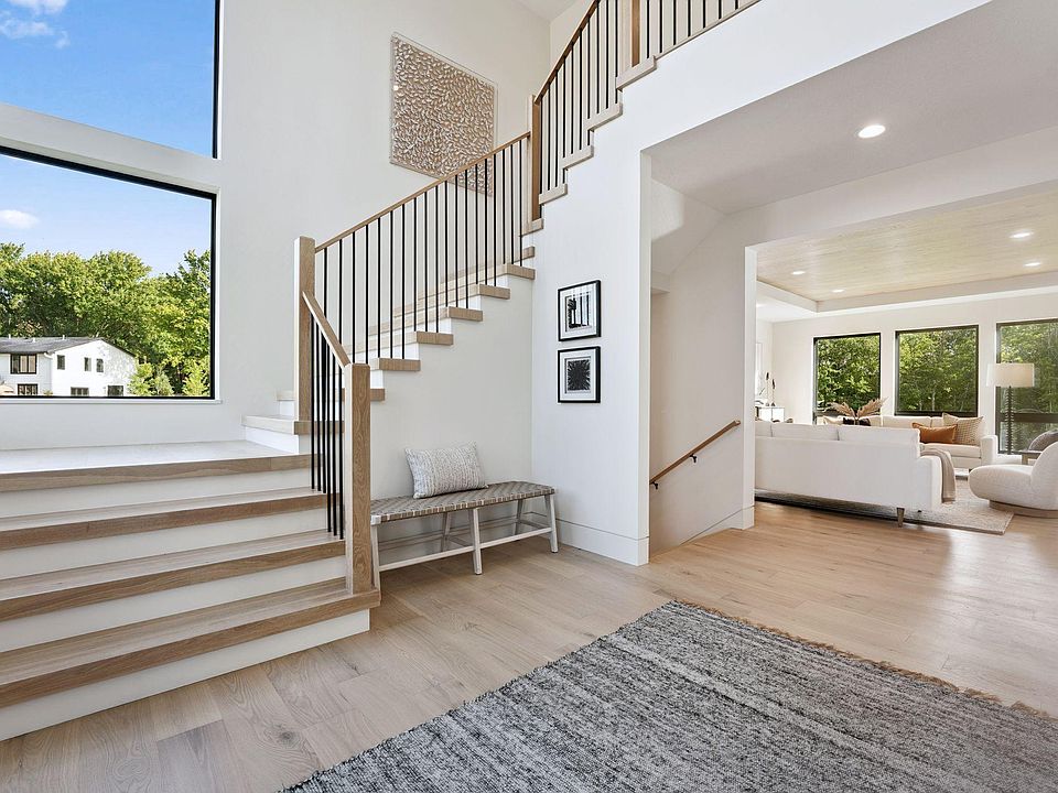The price of the home includes a striking exterior, which features a mix of James Hardie siding textures and black Marvin windows. Inside, you'll find wood flooring throughout the main level, leading up the staircase and into the hallway. The impressive gourmet kitchen comes equipped with a walk-in pantry, while the spacious primary suite includes a luxurious bathroom complete with a freestanding tub.