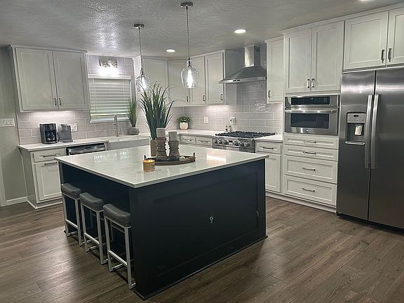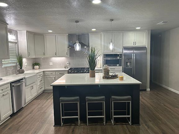 Inside, you’ll find an open-concept living, dining, and kitchen area designed for gathering. The kitchen features a 36” gas range and an oversized quartz island, perfect for entertaining or enjoying family meals. The home includes 4 bedrooms and 3 full bathrooms, with the luxurious master suite boasting its own dedicated AC system and a spa-like bath complete with a spacious two-person shower.