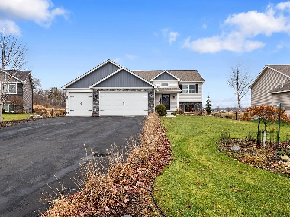 Located at the end of Harvest Drive in Lonsdale awaits your home sweet home. Built in 2019, this spacious split-level offers 6 bedrooms and 3 full bathrooms, including a private primary suite featuring a subway-tile tub surround and walk-in closet. The covered front porch leads you into the split-entry foyer with convenient garage access and a coat closet. The upper level boasts vaulted ceilings and an open-concept kitchen, living, and dining area. The kitchen is complete with white cabinetry, stainless steel appliances, a gas range, and a center island. Off the dining space, step out onto the maintenance-free deck overlooking scenic nature views, with stairs leading down to the fully fenced backyard. The lower level provides even more room to live and grow, offering a large family room, three bedrooms, a full bathroom, and the laundry/utility space. Need flexibility? With six bedrooms, you can easily repurpose rooms for a home office, workout area, craft room, playroom, or even a cozy home theater. This home is ideal for multigenerational living or for anyone who loves the option to spread out and enjoy their own spaces. Celebrate the Holidays or ring in the new year in your new Lonsdale home!