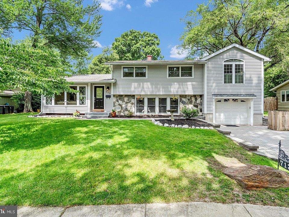 Remarkable home with two massive additions on a gorgeous lot in Evergreen Estates. The main level has gleaming hardwood floors with vaulted ceilings featuring a living room, dining room with bay window and an updated kitchen with 42" cabinets and granite counters. The upper level has four bedrooms including a massive master suite addition with vaulted ceilings, walk-in closet and enormous bathroom with walk-in shower and enough space for a future soaking tub. The other bedrooms have hardwood floors and are generously sized. The bathroom has been enlarged to include a bedroom level laundry room. The lower level has a large family room, den/office, full bath plus an in-law studio apt with kitchenette and half bath and private entry from the backyard or garage. There is a garage addition that includes a storage room and additional office space plus a double wide paver driveway. The backyard includes a large deck and the landscaping is beautiful. Truly a one of a kind house. Community pool is membership only.