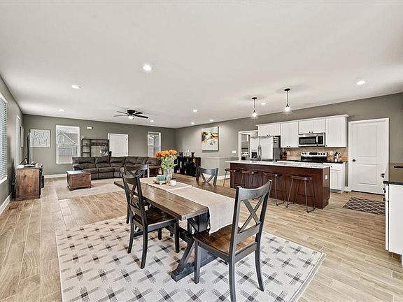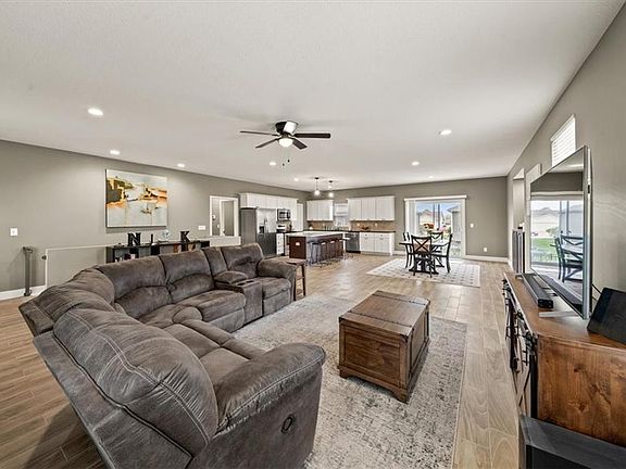 Like new spacious reverse ranch with a truly open main floor. Spacious living area flows to dining area with built-in hutch. Kitchen features a large pantry and island with ample space for four to sit. Main level also includes a half-bath, laundry, and the primary bedroom with bath. The large lower level includes a recreation area, two bedrooms, full bath, and ample storage. The garage is equipped with a 240V circuit, ready for a level two EV charging station. Fenced backyard. Lawn maintenance and snow removal provided. Fantastic community with easy access to the highway, stores, restaurants, and services.